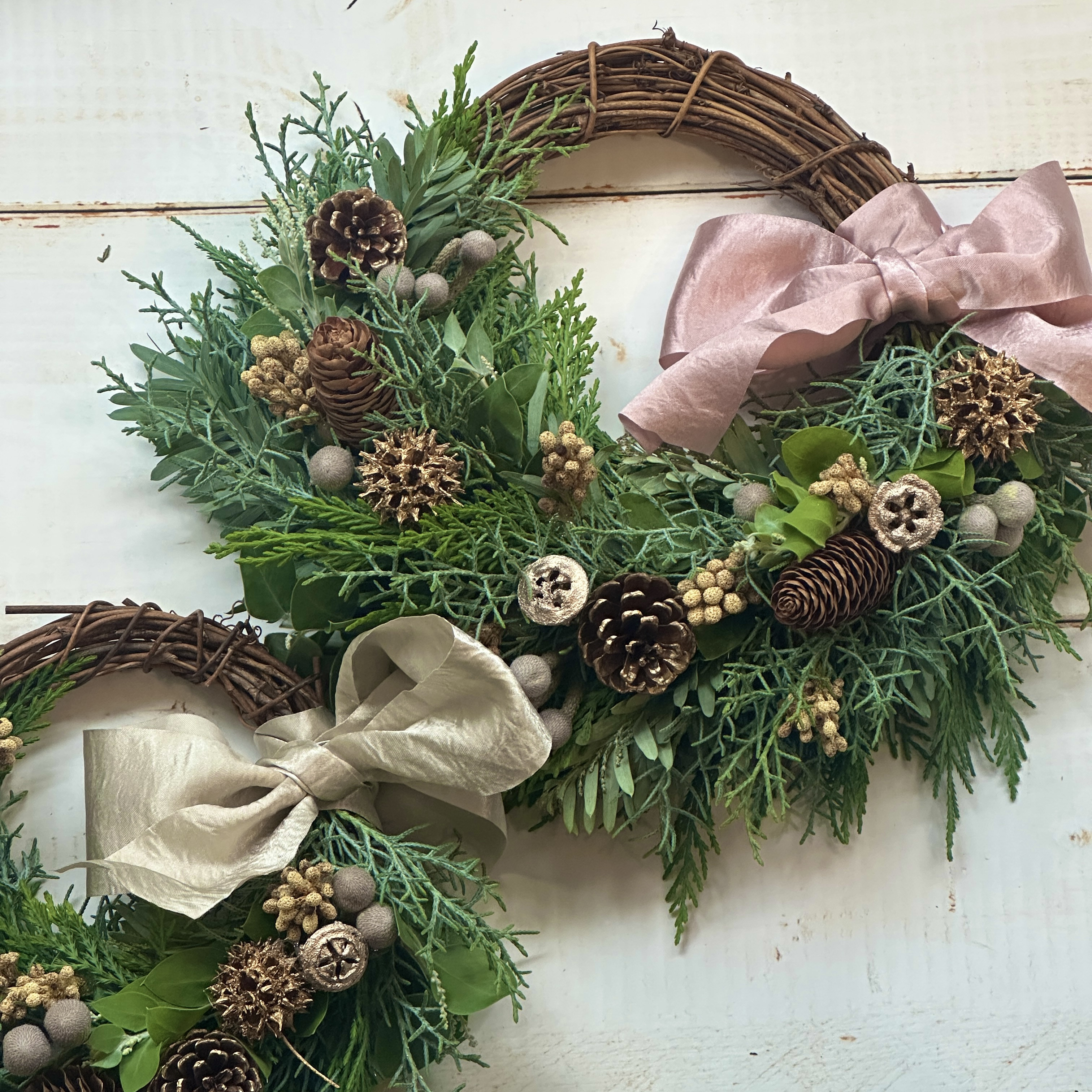 大倉山の古民家「アトリエ季布」で作る シャビーな大人カラーのリボンを添えたクリスマスハーフリース サイズと料金 20センチ 4500円 25センチ 5,500円 30センチ 6,500円 リボンの色はピンクかシルバーでお選び頂けます。 お申込みの際は必ず連絡事項の欄にご希望のサイズをお願い致します。